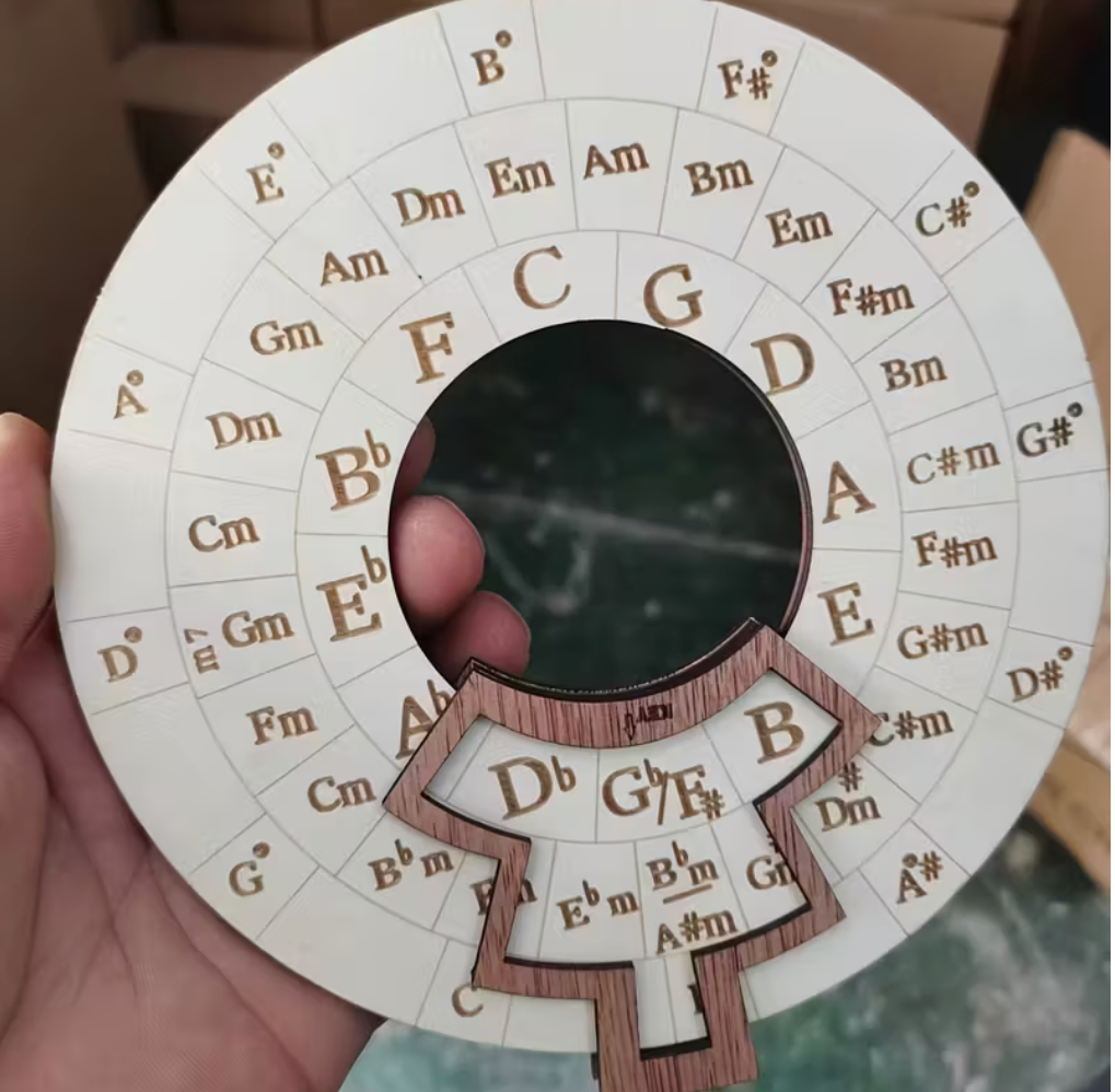 Eleganter Quintenzirkel aus Holz. Wunderbar für jene, die mehr Musiktheorie lernen möchten und/ oder gerne in der Musik improvisieren und die Tonleitern einhalten müssen.